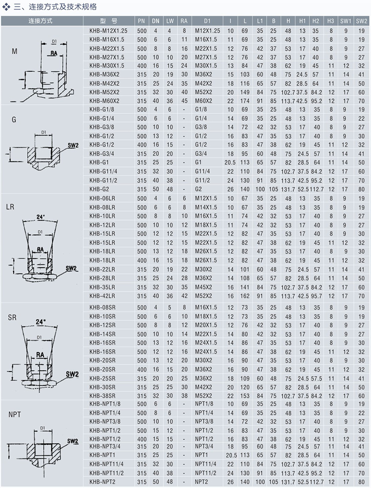 2、连接材料:G形式、LR形式、SR形式、M形式、NPT形式